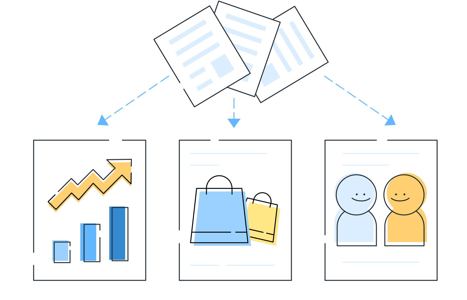將多平台資料自動分成「銷售、產品、顧客」資料庫,並會自動更新。