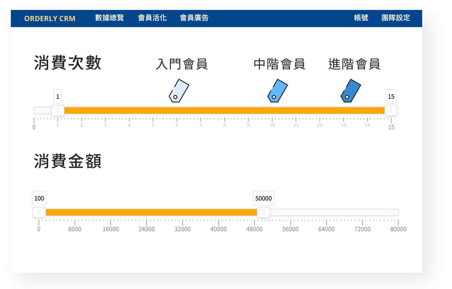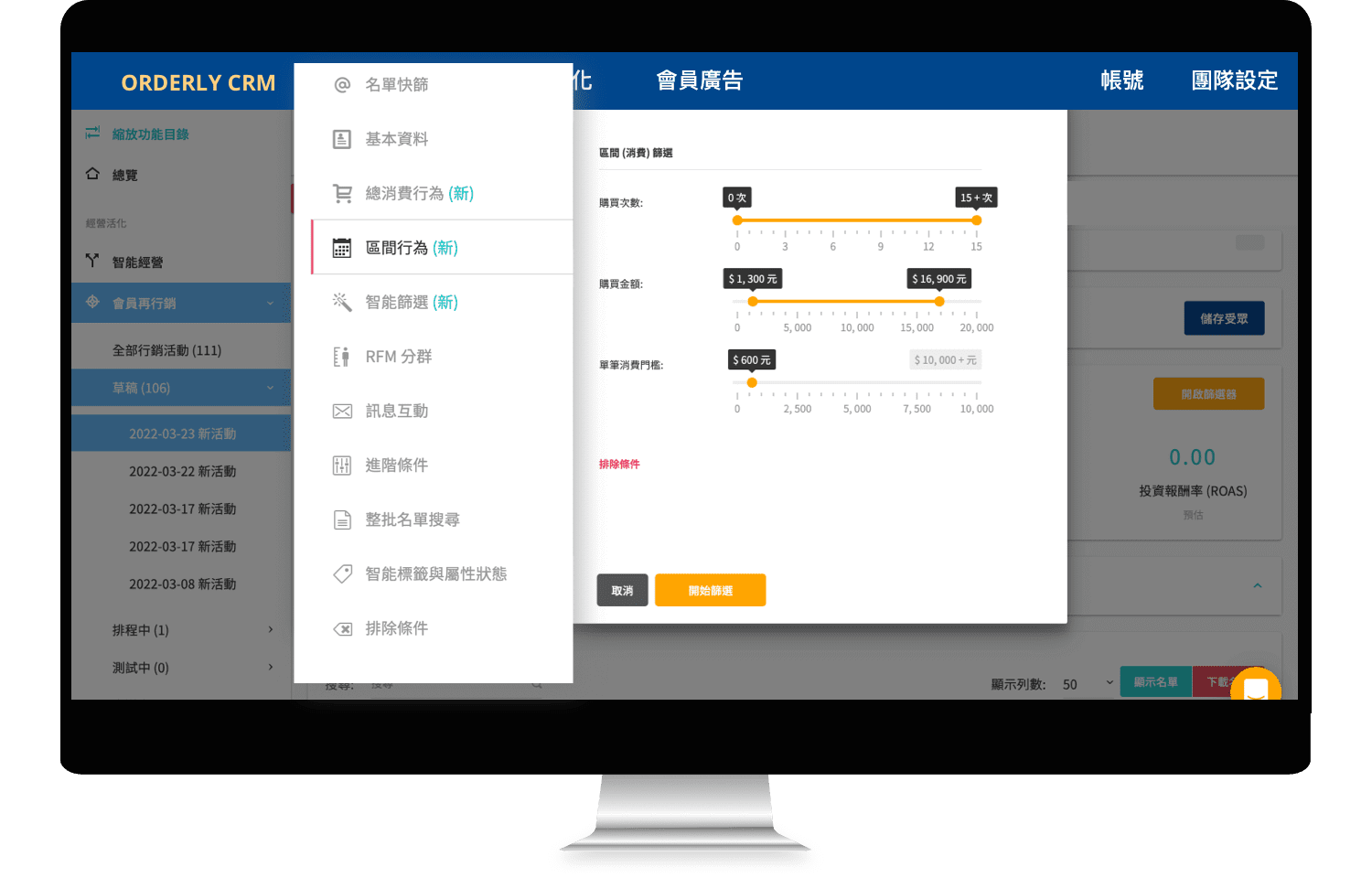 可依基本資料、總消費行為、區間行為、訊息互動、RFM 分群、標籤篩選等多樣化條件,進行精準分眾!